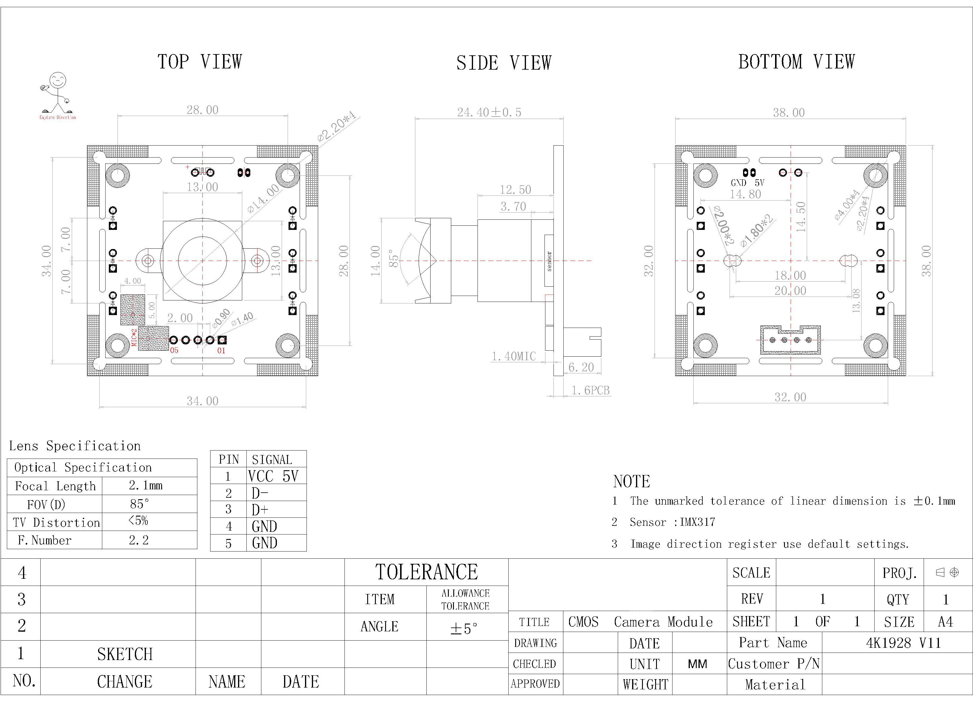 Fixed Focus 4K 8MP HD 3840*2160 IMX317 CMOS 30 FPS USB2.0 FOV 85 Degree Camera Module for Face Recognition